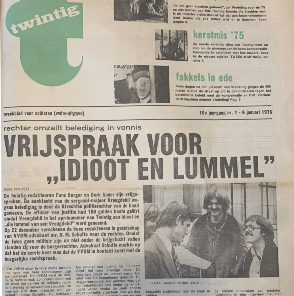 In 1973 he transformed Twintig, the association paper of the VVDM (Union of Conscripts), into an activist newspaper in the style of a sensational tabloid. Together with Derk Sauer he became, as a citizen journalist, the gadfly of the Dutch armed forces at a time when they were facing increasing social pressure.